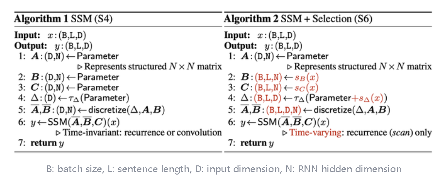 - 参数 B 和 C 的作用: 选择性最重要的特性是过滤掉无关信息,从而将序列模型的上下文压缩成有效的状态。在 SSM 中,修改 B 和 C 使其具有选择性,可以使模型能够更精细地控制输入和状态的流动。