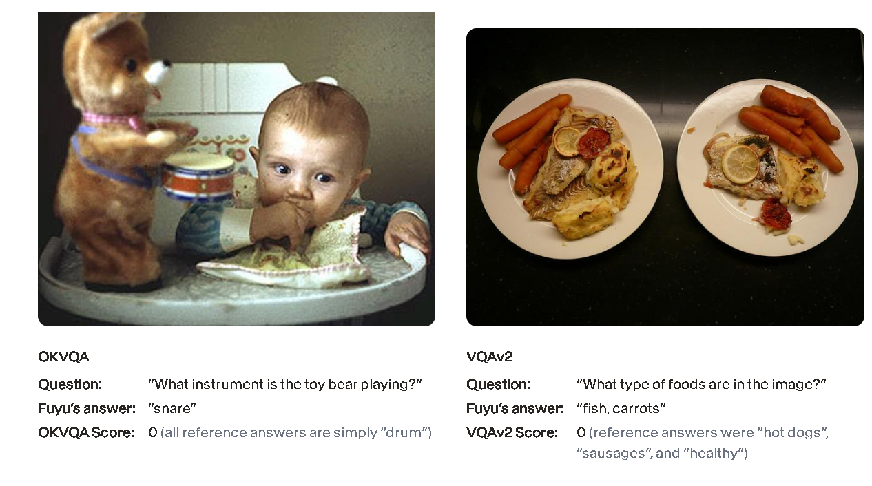 对于 OKVQA 数据集左侧的图像,当被问到“玩具熊正在演奏什么乐器?”时,模型回答“军鼓”——这显然是正确的!然而,它的得分为 0,因为所有参考答案都只是“鼓”。同样,对于右侧的 VQAv2 图像,当询问“图像中的食物类型是什么?”时,模型正确地回答“鱼,胡萝卜”,但它也得到 0 分,因为参考解决方案列表没有包含这些词。