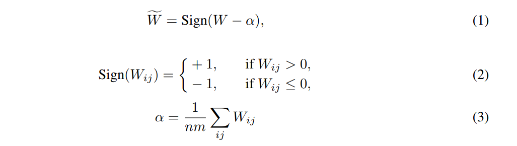 我们首先用sgn函数将权值二值化为+1或- 1。我们在二值化之前将权重集中为零均值,以在有限的数值范围内增加容量。在二值化后使用一个比例因子β来减小实值和二值化后的权重之间的l2误差。权W∈Rn×m的二值化可以表示为: