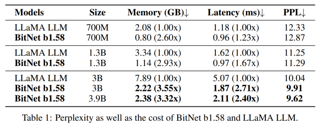 表 1 总结了 BitNet b1.58 和 LLaMA LLM 的困惑度和成本:在困惑度方面,当模型大小为 3B 时,BitNet b1.58 开始与全精度 LLaMA LLM 匹配,同时速度提高了 2.71 倍,使用的 GPU 内存减少了 3.55 倍。特别是,当模型大小为 3.9B 时,BitNet b1.58 的速度是 LLaMA LLM 3B 的 2.4 倍,消耗的内存减少了 3.32 倍,但性能显著优于 LLaMA LLM 3B。