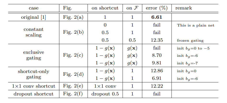 下图是不同顺序的残差块结构和实验结果,指标是分类错误率: