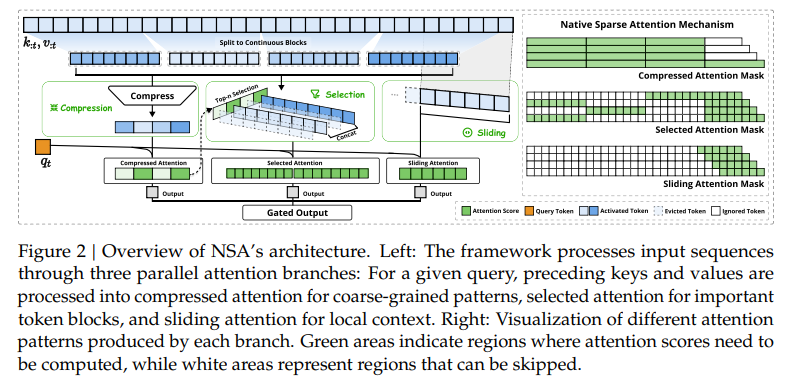 其中定义了三种注意力:压缩(cmp)、选择(sle)、滑窗(win),并最后使用门控来简单汇聚,$g^{cmp}o^{cmp}+g^{sle}o^{sle}+g^{win}o^{win}$。