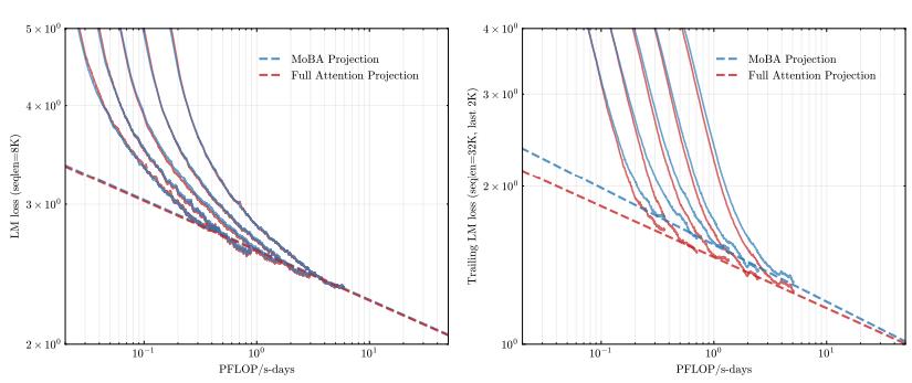 MoBA的损失曲线一开始不如full attention,但后续逐渐重合。