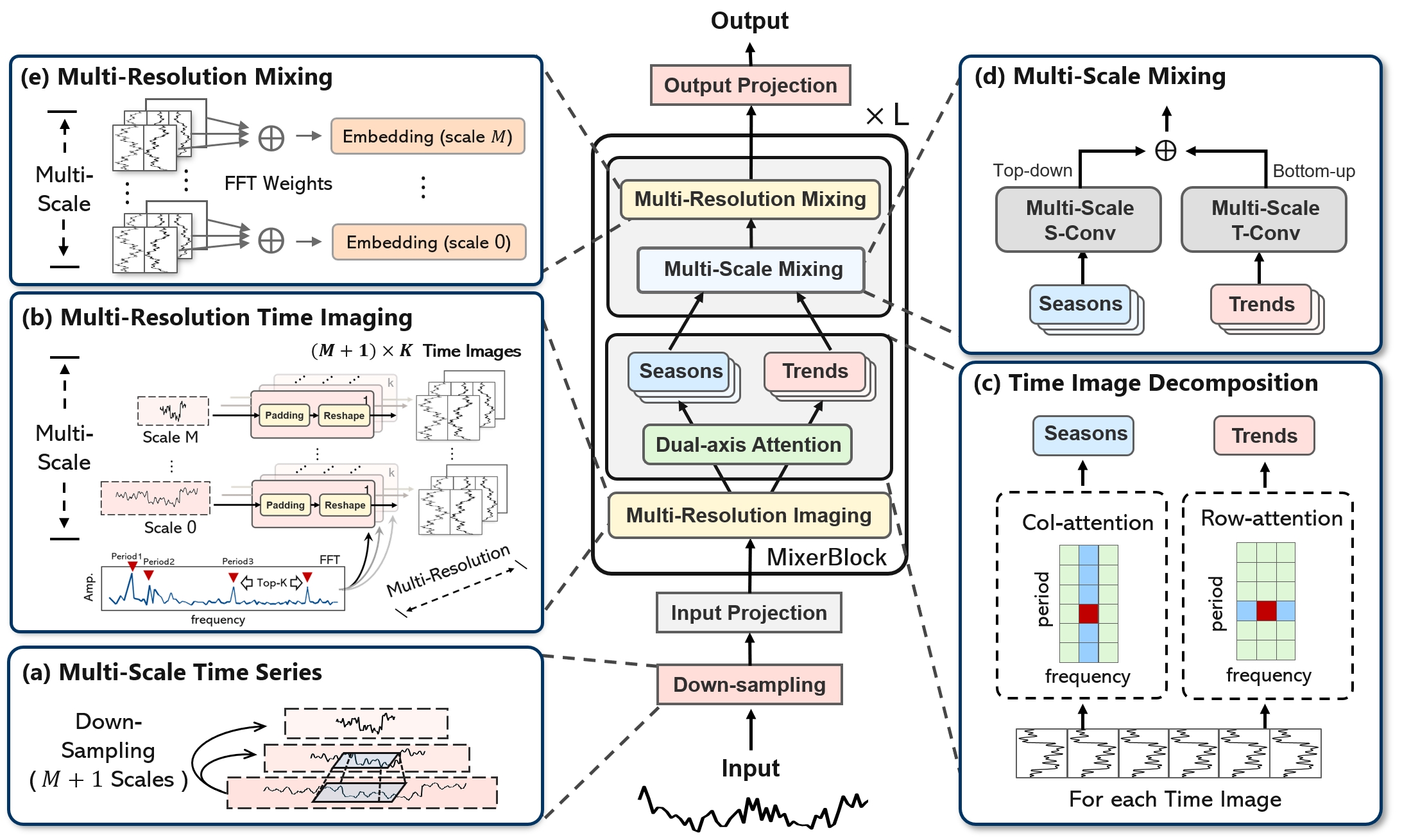 摘要: 时间序列分析在众多应用中扮演着关键角色,支持预测、分类、异常检测和插补等任务。在这项工作中,我们提出了时间序列模式机(TSPM),这是一种通过强大的表示和模式提取能力在广泛的时间序列任务中表现出色的模型。传统的时序模型往往难以捕捉普遍模式,限制了它们在多样化任务中的有效性。为了解决这个问题,我们在时间域中定义了多个尺度,在频域中定义了各种分辨率,采用各种混合策略来提取复杂、任务自适应的时间序列模式。具体来说,我们引入了 TimeMixer++,这是一种通用的 TSPM,使用(1)多分辨率时间成像(MRTI)、(2)时间图像分解(TID)、(3)多尺度混合(MCM)和(4)多分辨率混合(MRM)来提取全面的时序模式。MRTI 将多尺度时间序列转换为多分辨率时间图像,捕捉时间和频率域中的模式。 TID 利用双轴注意力提取季节性和趋势模式,而 MCM 按层次将这些模式在各个尺度上聚合。MRM 自适应地整合所有分辨率下的表示。TimeMixer++在 8 个时间序列分析任务中实现了最先进的性能,持续超越通用和特定任务的模型。我们的工作标志着向下一代 TSPM 迈出的一个有希望的步伐,为时间序列分析领域的进一步发展铺平了道路。