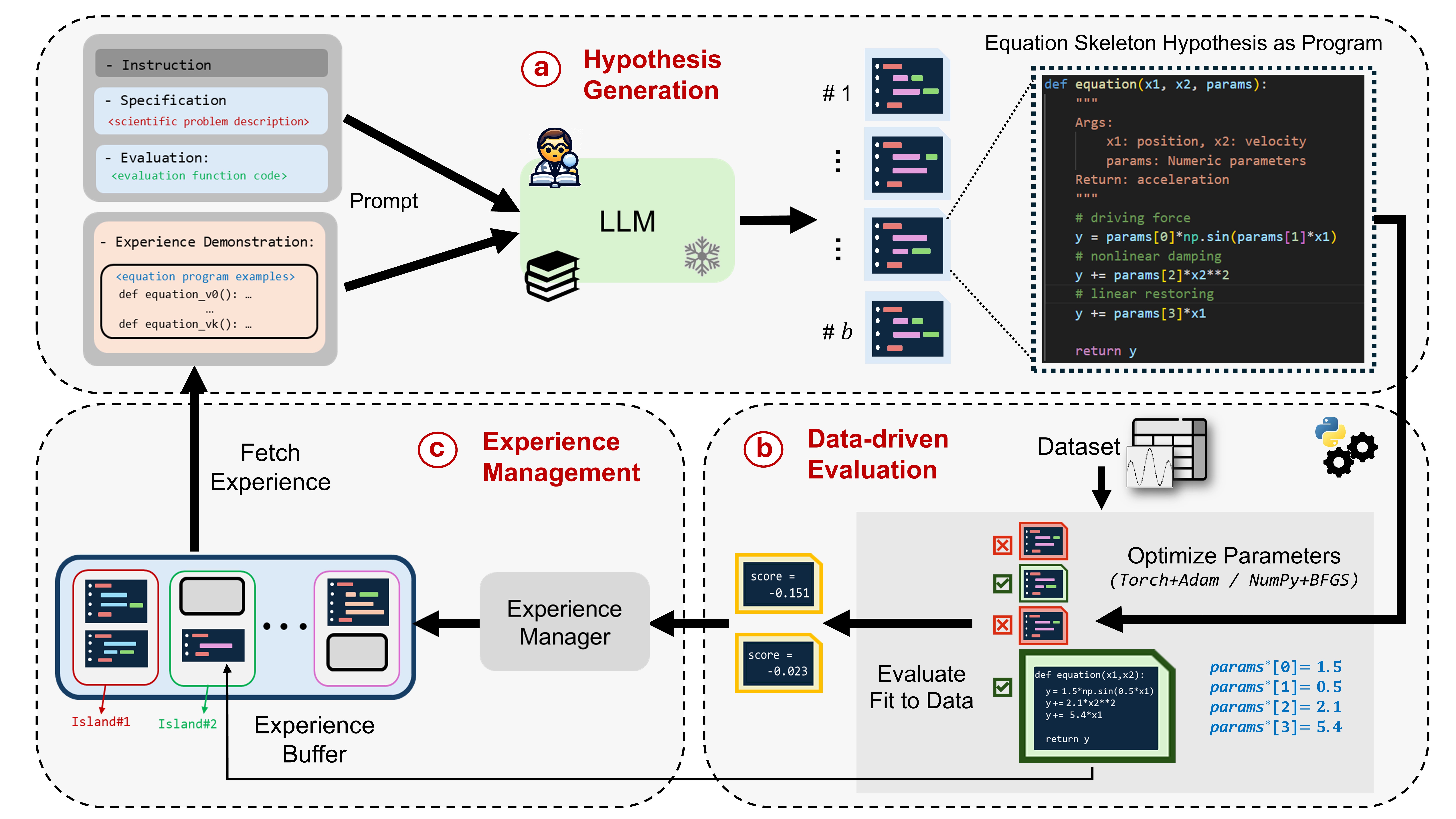 该程序化表示极大扩展了表达式的表达能力,但也带来了庞大的搜索空间。LLM-SR 通过引入领域先验、逐步迭代优化以及经验缓冲机制,有效聚焦搜索到高质量区域。