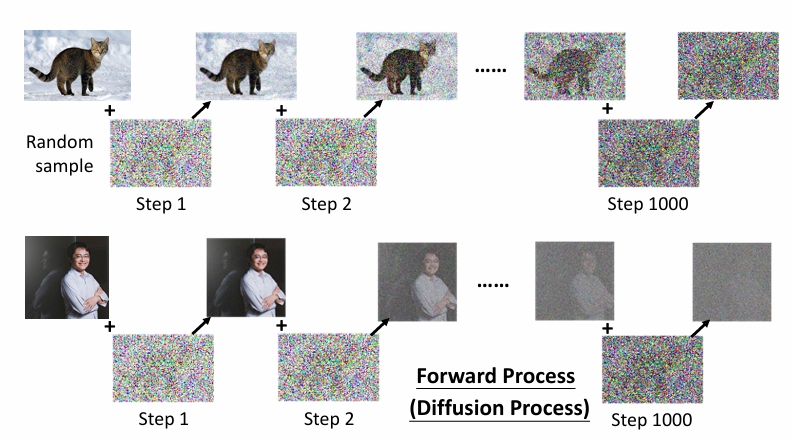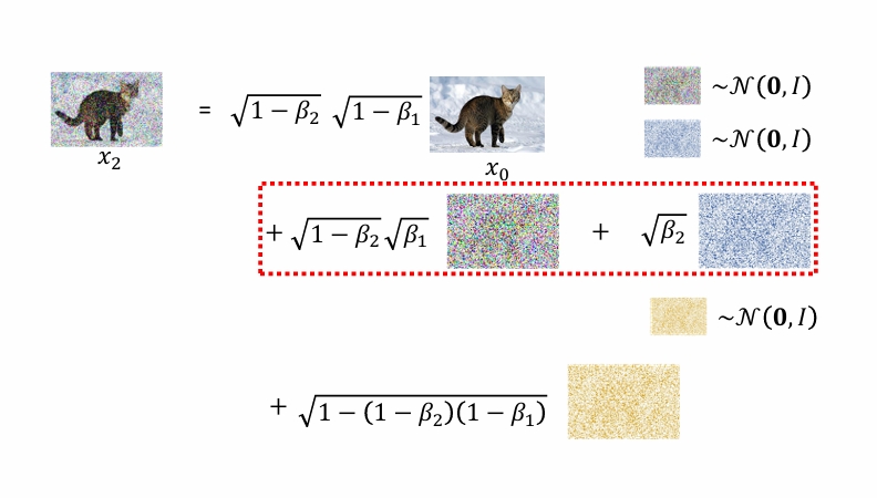 这种原理其实很显然,比如像GAN和VAE,从特定分布中抽取并生成,image = f(noise)。Diffusion也是这样,只要我们能通过一个g(image)=noise,那么我们就能从g(image)=noise中得到image = f(noise)。但由于神经网络的复杂性(一个黑盒子很难找到它的反函数),所以Diffusion做的处理是,加噪使用简单的操作,去噪再使用神经网络,而不是两者都用神经网络。(这样做也更简单。)