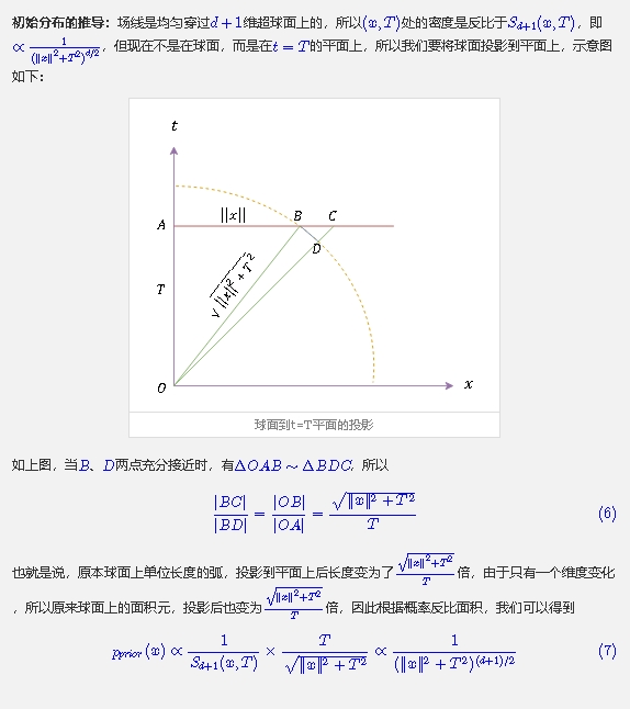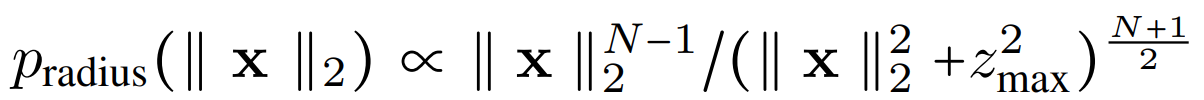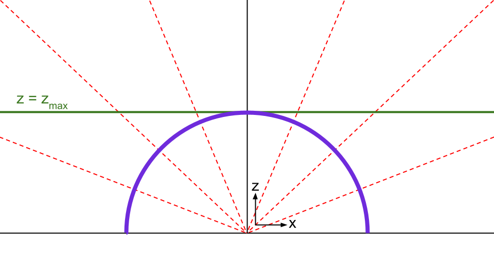 为绕过这个问题,将半球上的均匀分布投影到与半球顶部重合的超平面 zmax 上。由于泊松场在 x 趋向于无穷大时是纯径向的,因此投影是一个简单的径向投影。下面是一个 2D 示意图,其中红色线条连接球面上的紫色点到绿色线上的投影点。