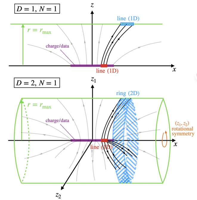 我们继续沿用PFGM的算法,$\hat x=[x,z]^T$,其中$z\in R^D$,则N+D维空间中的场为: