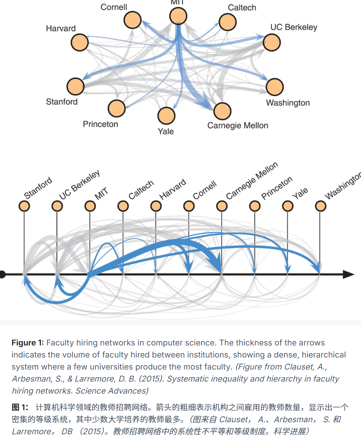 网络是粘性的:精英学校相互招聘更多,这加强了他们的主导地位。这不仅仅是一种感觉;数据支持它。不成比例的教职工作流向了少数大学(众所周知的“四大”:麻省理工学院、斯坦福大学、伯克利大学、卡内基梅隆大学)的毕业生。