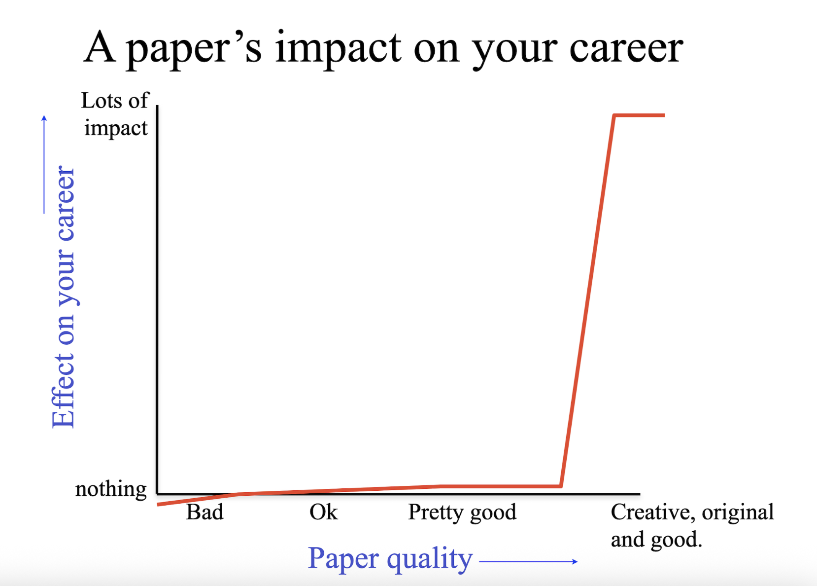 当然,时机很重要。你不能总是预测哪些论文会产生重大影响——研究本质上是不确定的。有些论文需要时间才能产生明显的影响。有些人很早就找到了他们的定义项目,而对于其他人来说,这需要更长的时间。两条路都很好。关键是要保持雄心勃勃的心态。以让你兴奋并提出新问题为目标的工作,或者想一想你钦佩的研究人员会说“我为什么没有想到这一点”或“哇,这是一个巧妙的想法,而且非常有用”的问题。为了培养这种雄心勃勃的思维,我一直很喜欢我的博士生导师的挑衅口号:“我需要解决什么问题才能成名?