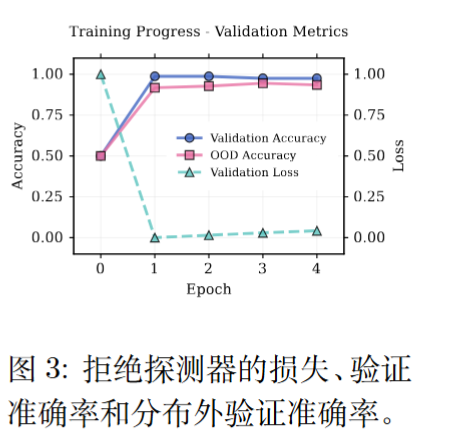 由于这一线性特性,可以使用一个简单的线性分类器 i.e.,一个拒绝探测器来有效识别该方向。拒绝探测器是一个逻辑回归模型,它以token 位置 j 处的隐状态向量 $h_j \in H$ 作为输入,并输出拒绝的概率。