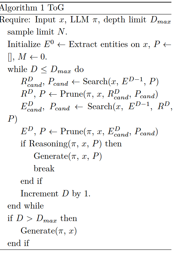 在每次迭代后,LLM 会评估当前收集到的路径信息是否足以回答问题。如果足够,则生成答案;如果不足,则继续下一轮深度的探索,直到达到最大搜索深度 。
